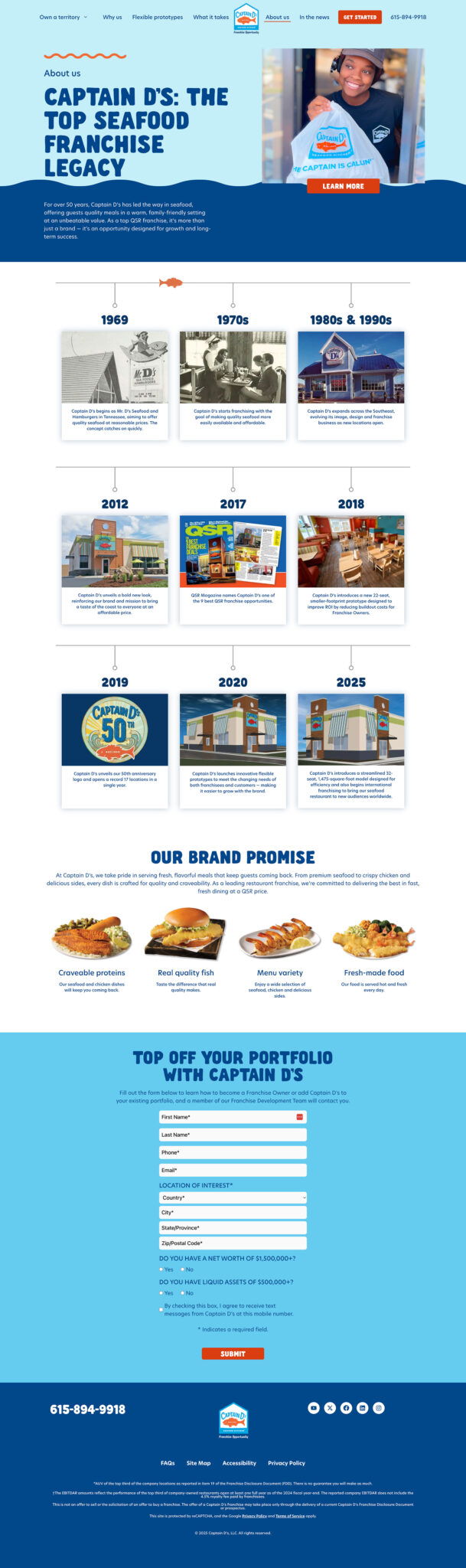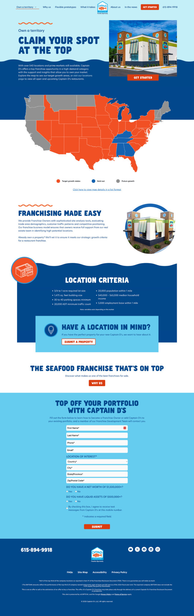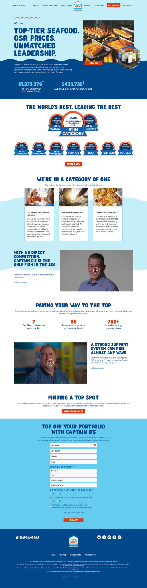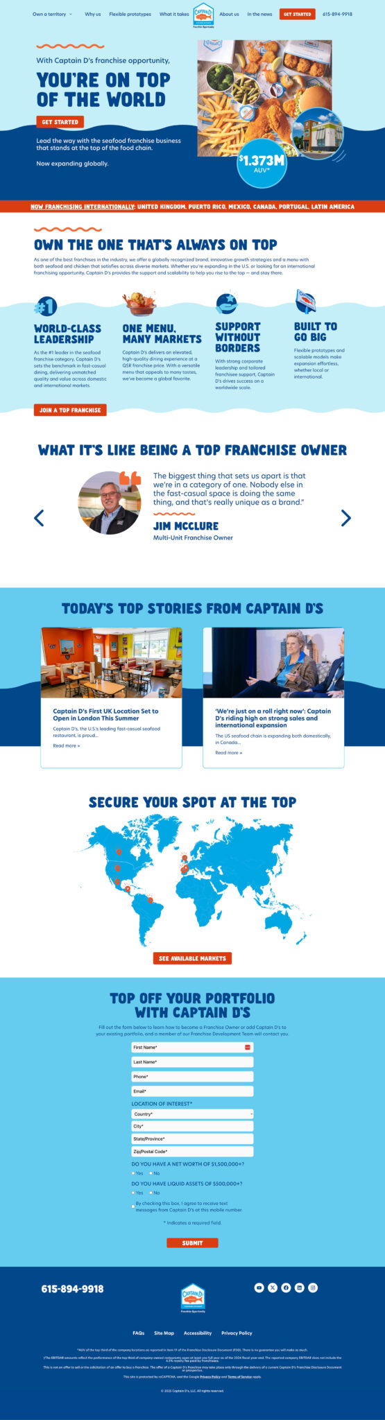High-performance WordPress website development for Captain D’s, designed to attract franchisees with scalable content blocks, animated stats, and a modern nautical aesthetic.