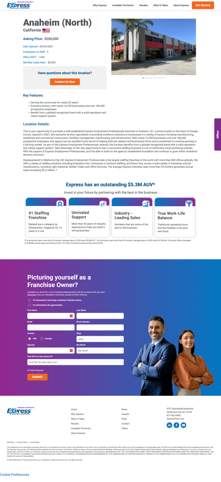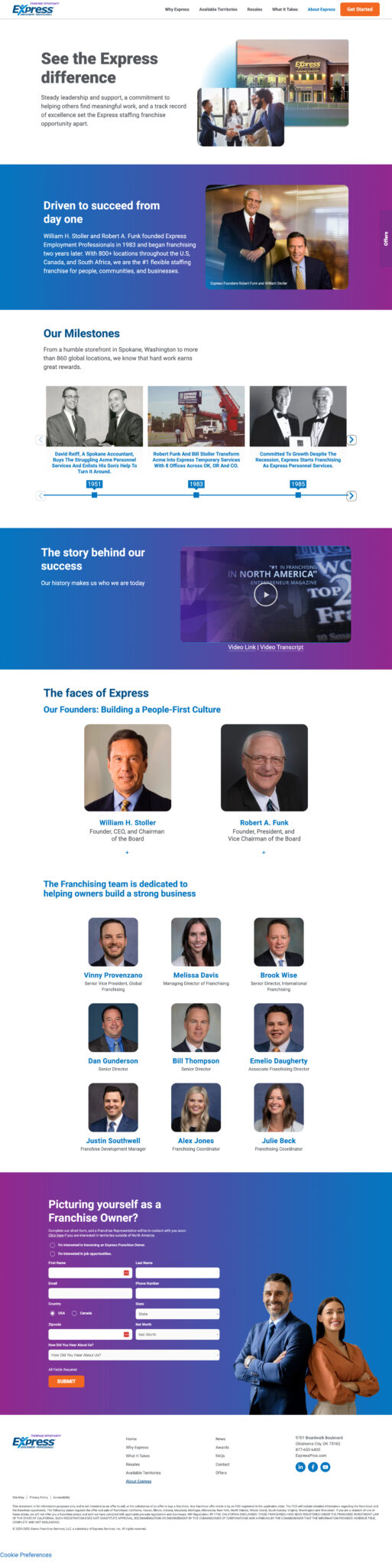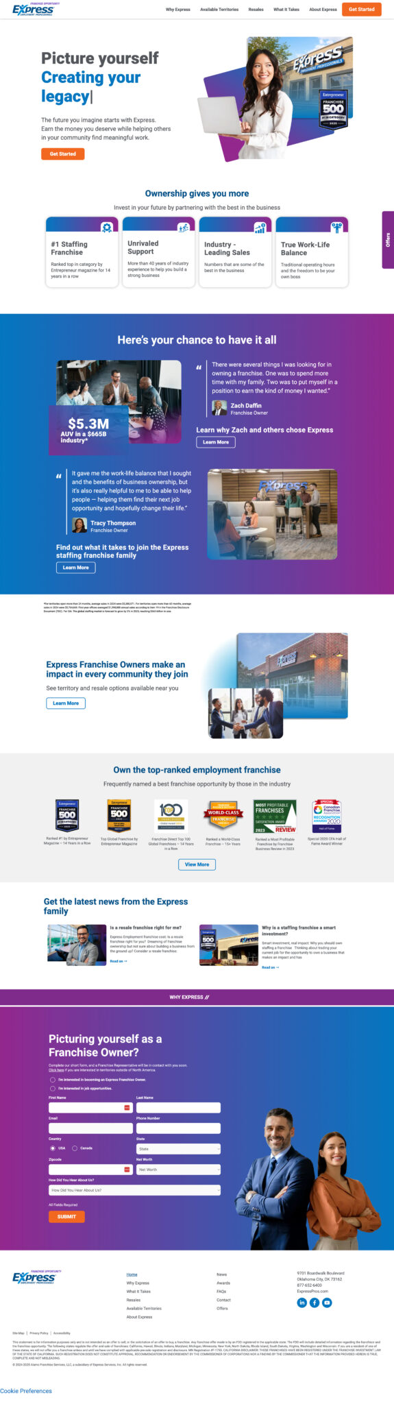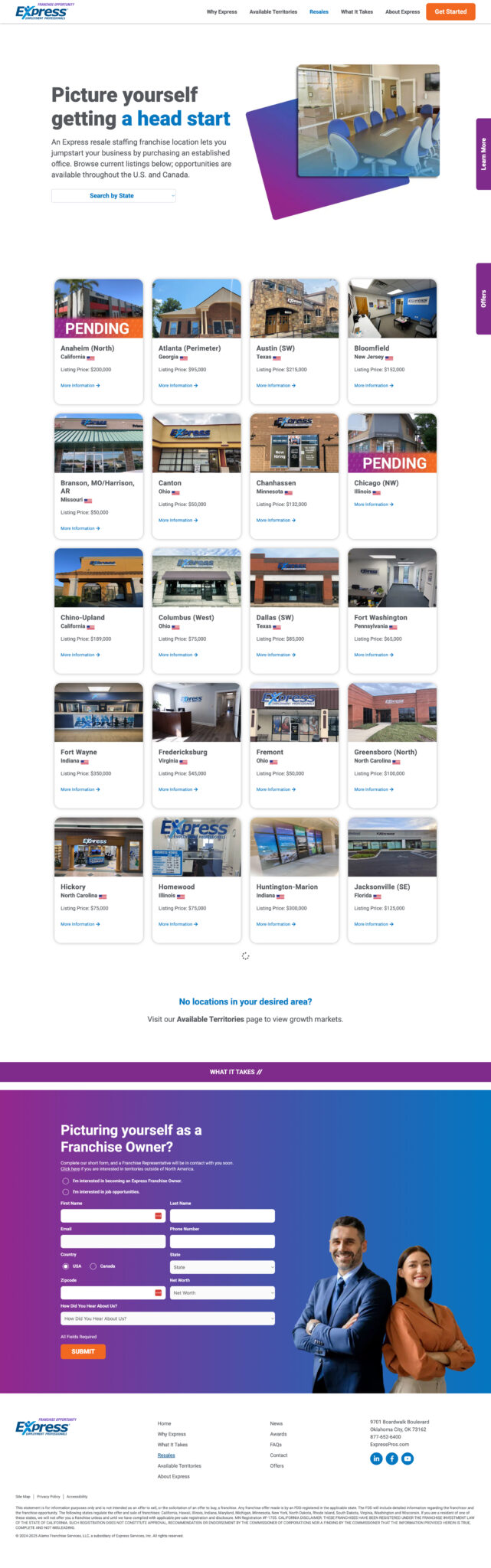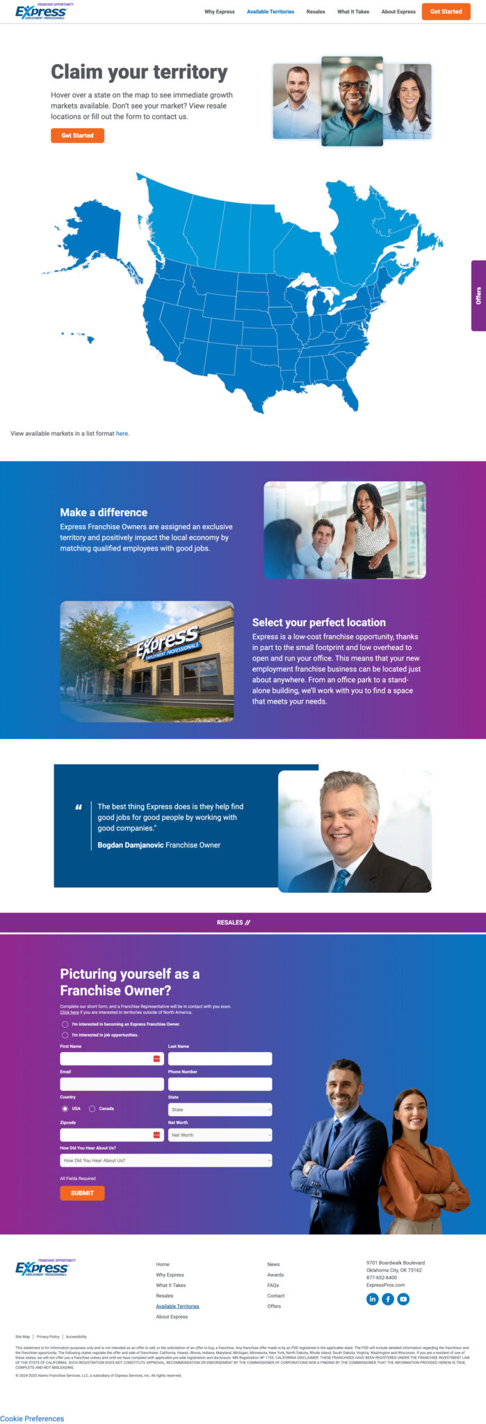 For the Express Franchising redevelopment, the build delivers a modular system with an interactive Territories experience (SVG map plus full list-view fallback for SEO and accessibility), a Resales hub with filters and detail views, and a “What It Takes” pathway outlining financials and the six-step journey. The About timeline and leadership are structured for deep-linking. Site-wide CTAs keep next steps clear, and a unified lead form, with conditional fields for interest, geo, and net worth captures clean UTM/source data into the CRM.